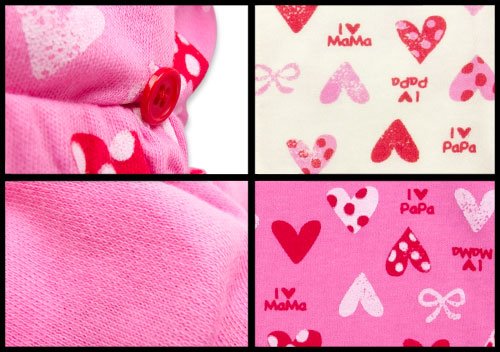 商品説明:超人気アイラブパパ&ママからハートがいっぱいの愛らしい前開き長そでパジャマです 保湿性・伸縮性に優れたスムス素材使用 おなかがでない脇ボタン付き、寝相の悪いベビーちゃんも寝冷えしません。 いろいろなパターンのハートとCUTEなリボン、パパ・ママロゴもプリントされてとびっきり可愛い。お色はアイボリー、ピンクの2色展開です。