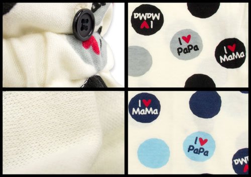 商品説明:超人気アイラブパパ&ママからアイボリーの生地に水玉柄が可愛い前開き長そでパジャマです 保湿性・伸縮性に優れたスムス素材使用 おなかがでない脇ボタン付き、寝相の悪いベビーちゃんも寝冷えしません。 水玉模様のなかにはアイラブパパとママのロゴが。全身で大好きパパ&ママアピールしちゃおう お色はグレー×ブラック、サックス×ネイビーの2色展開です。