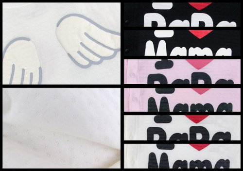 商品説明: アイラブパパ&ママのアイラブロゴ入りラブ天使コンビドレスです 薄く中わたを入れ適度に空気を含ませて編んだ生地を2重にした、薄手ながら保温性に優れたエアーニット使用。 右肩からおまたのスナップで着脱もラクラク ベビーちゃんの成長に合わせて2通りの着用が可能☆ 最初はドレスにして足元ゆったり 動きが活発になってきたらおまたのホックをとめてカバーオールにして足もとすっきり お胸にはシンプルだけど存在感バツグンのアイラブロゴ☆大好きパパママアピールしちゃおう なんといっても背中の肩甲骨部分にチョイもこもこの天使のはねプリントが激カワ 天使のようなベビーちゃんにぴったりだね☆ お色はブラック、ホワイト、ピンクの3色。 それぞれパパママ2展開です サイズ: 50-60 カラー: ブラック(パパ・ママ)/ホワイト(パパ・ママ)/ピンク(パパ・ママ) 素材: 表側・綿100% 中わた・ポリエステル100% 裏側・綿100% 原産国: 中国