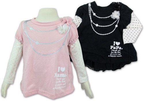 アイラブパパ&ママのレイヤードネックレス風プリント長そでTシャツです 肌ざわりの良い透かし編みの針抜き天竺使用 胸もとまわりには銀のネックレスだまし絵プリント☆ 左肩にはシンプルなコサージュが縫い付けられています 後ろのシルエットはリボンがついて、その下からチュール&シースルー使いでとってもCUTE パフ袖と水玉袖のレイヤードなのもうれしい☆ お色はパパブラックとママピンクの2色展開です サイズ: 80/90/95 カラー: パパブラック/ママピンク 素材: 本体・綿100% 付属生地・ポリエステル100% 原産国: 中国