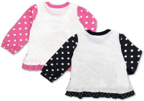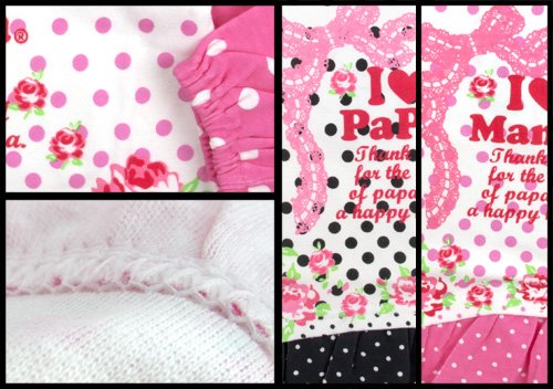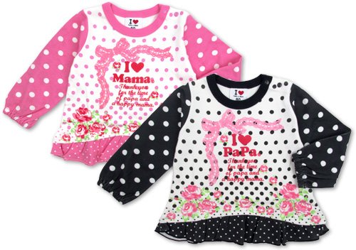 超人気アイラブパパ&ママのドット柄とお胸のレースリボンプリントの相性バッチリ☆Aライン長そでTシャツです 保湿性・伸縮性に優れた綿スムス素材使用 左肩のスナップで着脱ラクラク☆ お袖部分と裾のフリル部分はおんなじお色でCUTE 前身ごろはレースリボンとお花柄☆その間にアイラブロゴで女の子らしく Aラインシルエットなのもうれしいね☆ お色はパパブラックとママピンクの2展開です サイズ: 80cm/90cm/95cm カラー: パパブラック/ママピンク 素材: 本体・綿100% 原産国: 中国