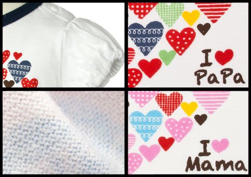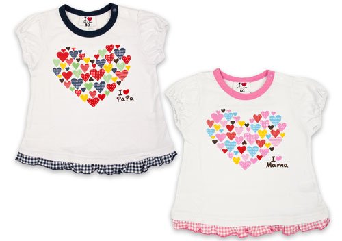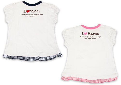 商品説明: 超人気アイラブパパ&ママからCUTEなハートでいっぱいの半そでTシャツです 汗を吸収しやすくニット生地では定番の天竺使用 左肩のスナップで着脱ラクラク <100号サイズについて>生地の特性と首周りサイズを考慮し、100号サイズのみ、肩部分のスナップ(ボタン)が付いていない商品が御座いますので、ご了解下さい。 もちろん、着用時に支障はありません。 お胸はたくさんの小さなハートで出来たハートマーク 左側にはアイラブパパorママのプリント入りです パフスリーブと、裾に広がるチェック柄フリルでCUTEさ更にup お色はパパネイビーとママピンクの2色展開です サイズ:80cm/90cm/95cm/100cm カラー:パパネイビー/ママピンク 素材:本体 綿100%リブ部分 綿95% ポリウレタン5% 原産国:中国