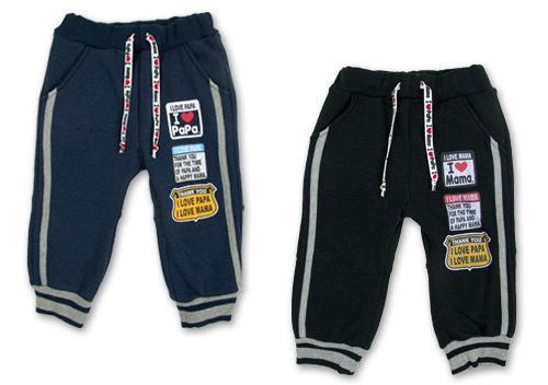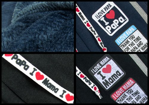 アイラブパパ&ママの左側にアイラブプリントが入ったパンツです。 お肌に触れる面はふわふわの起毛でベビーちゃんもあったか☆ アイラブパパママのプリントが入ったひも付 (ひもは飾りです) 左側に3つのアイラブワッペン風プリント☆ おしりにもどんとアイラブパパ・ママのプリント入り ウェストはゴムなのでとってもらくちんだね☆ グレーのサイドラインもポイント お色はママブラックとパパネイビーの2色展開です サイズ: 80/90/95 カラー: ママブラック/パパネイビー 素材: 本体・ポリエステル80% 綿20% リブ部分・綿95% ポリウレタン5% 原産国: 中国
