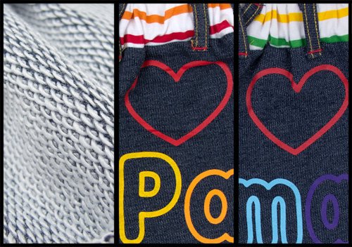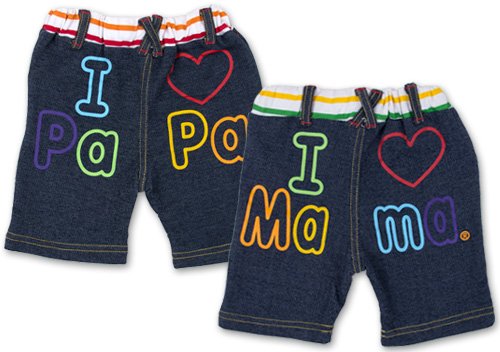超人気アイラブパパ&ママのアイラブカラープリントパンツです 見た目はデニムのようだけど、ニットならではの風合いストレッチ性を兼ねたデニムニット使用 カラフルなボーダープリントが入ったウエストはゴムなので着脱も ラクラク☆ おしり部分に入ったアイラブパパ、ママのカラープリントで色鮮やか 大好きパパママアピールしちゃおう☆ 前についた飾りボタンも見逃せない お色はパパとママの2色展開 サイズ: 80cm/90cm/95cm カラー: パパ/ママ 素材: 本体 綿55% ポリエステル45% ウエスト部分 綿100% 原産国: 中国