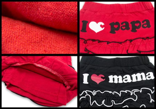 大人気のブランド、アイラブパパ&ママより、いっぱいのフリルが嬉しいショートスカパンです 汗を吸収しやすく、ニット生地では定番の肌着やTシャツによく使われる天竺綿使用 見た目は完全にスカートだけど1枚めくるとショートパンツなので、アクティブなベビーちゃんに最適 お色はパパレッドとママブラックの2色展開です サイズ: 80/90/95 カラー: パパレッド/ママブラック 素材: 本体・綿100% リブ部分・綿95% ポリウレタン5% 原産国: 中国