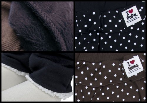商品説明: アイラブパパ&ママの水玉スカートスカッツです。 お肌に触れる部分は伸縮性に優れたストレッチ起毛、スカート部分はスムス素材使用。 スカート前、ちょうど左腰部分にはアイラブパパ・ママの布タグ付き。 さりげない裾レース使いと、裾くしゅのスパッツ部分も注目 お色はパパブラックとママブランの2色展開です。 サイズ: 80cm/90cm/95cm/100cm カラー: パパブラック/ママブラウン 素材: スカート部分 綿100% 本体 ポリエステル75% 綿20% ポリウレタン5% リブ部分 綿95% ポリウレタン5% 原産国: 中国