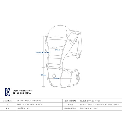使用可能時期 :3ヶ月(首座り時期)~36ヶ月. 構成品: ヒップシート,キャリア,スリービングフード, オーガニックよだれバット. 素材 : 100%綿/メッシュ. 原産地/製造社 :韓国/アイエンジェル社.
