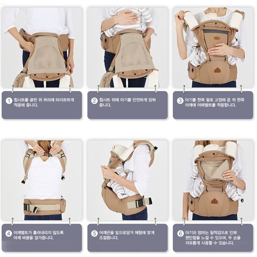 - ①ヒップシートを骨盤上にタイトに着用します。 ②ヒップシートの上に赤ちゃんを座らせます。 ③赤ちゃんを片手で支え、肩にベルトを装着します。 ④肩のベルトが落ちないようにバックルでとめます。 ⑤肩ひもを前に引っ張り、体に合わせて長さを調節します。 ママと赤ちゃんが密着するように調節します。