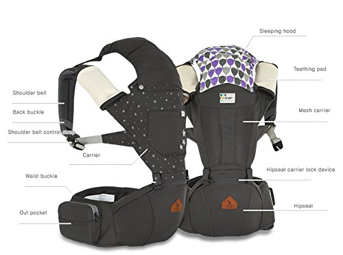 1. Organic teething pad 2.Sleeping hood 3.Shoulder strap 4.waist buckle 5. out pocket 6. Hip seat 100% cotton / Sleeping hood : 100% cotton / teething pad : Organic 100%
