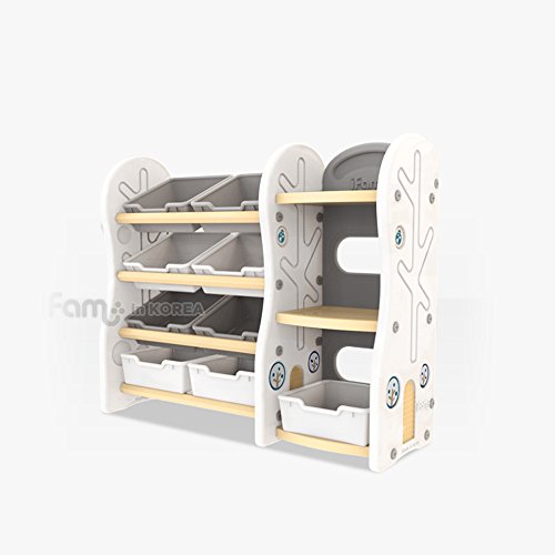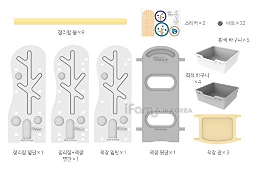 - 構成:整理箱 サイド パネル 1EA、整理箱+本棚の横パネル1EA、本棚の横パネル1EA、本棚裏パネル1EA、整理箱棒8EA、本棚パネル3EA、白バスケット5EA、灰色バスケット4EA、ステッカー2A、ナット32EA