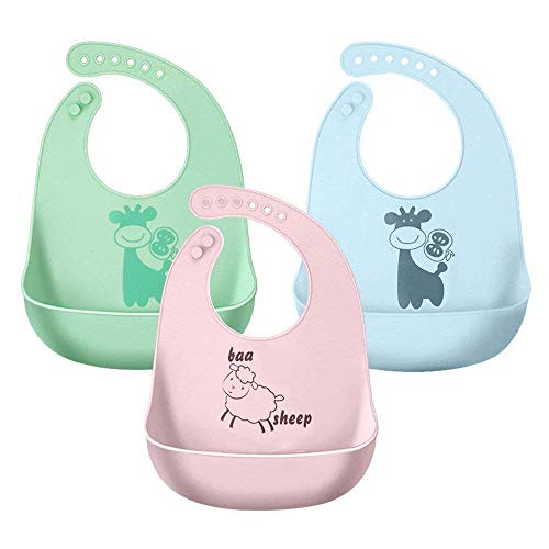 赤ちゃん お食事エプロン シリコン(3点セット) 6段調節 6ヶ月から5歳まで適用 保育園 離乳食 柔らかい 防水 清潔易い 持ち運び便利 ベビー ビブ スタイ 出産のお祝い(ピンク/緑/青い)