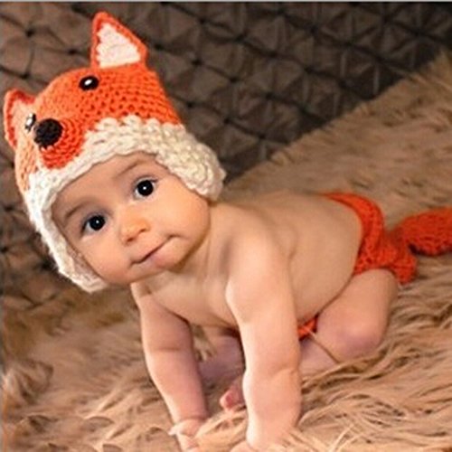 かわいいオレンジ色のキツネの赤ちゃんの写真から3ヶ月ニットかぎ針編みビーニープロップセット