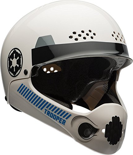 Become a Storm trooper and ride into action with the new star Wars Storm trooper chin bar multi sport child helmet. For ages 5 - 8 years. Vented eva-lined chin bar surrounds the face for additional coverage and protection and built-in cheek pads provide a secure fit. Side-squeeze buckle makes for easy adjustment - caged venting - 8 Hexagon covered vents for a much cooler ride. Comfortable neck roll for increased padding and correct positioning. Hard-shell construction for dual certification: CPSC 1203 bike and ASTM F1492 skate compliant.