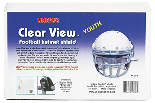 Shatterproof football helmet eye shield. Clear lens is legal for play. Fits most YOUTH football helmets.