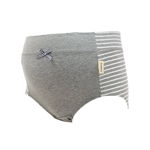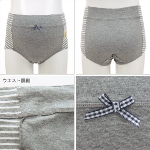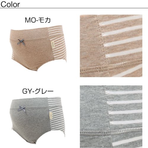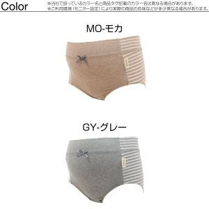 ボーダーに中心のギンガムチェックのリボンがオシャレ!産前、産後使える、ウエストをしめつけにくいショーツです。臨月の大きなおなかも締めつけません。元のお腹に戻りきらない産後すぐにも着用できます。腹部はゴムを使用せずベア天竺で幅広らくちん2重仕立てです。後ろウエスト部分は、よりフィット感のある3重仕立てです。マチ裏は肌にやさしい綿100%です。足口のゴムは身生地でくるんでいるので足口を締めつけにくく、痛くなりにくい仕様。左サイドのネームは外付けなので肌を刺激にくいです。お揃いのシリーズとのコーディネイトをおすすめします。綿95% ポリウレタン5%・着用時期の目安:産前-産後・縦横に伸縮性あり・クロッチ:付き・透感:なし・股上:M-Lサイズ約21cm L-LLサイズ約22.5cm(※置き寸法)