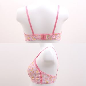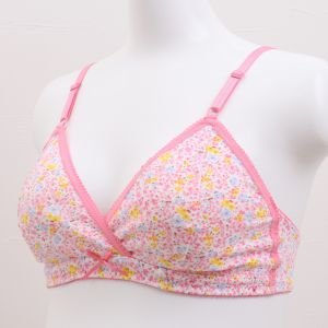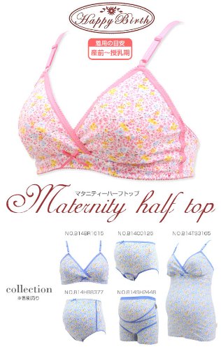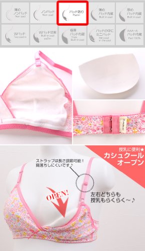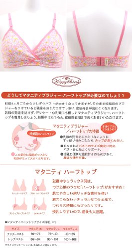 おしゃれに着こなせるスッキリとした三角ブラデザインのハーフトップです。授乳時はクロスオープンから胸がサッと出せます。取り外し可能なパッド付です。ホックは2段4列です。ネームは外付けで、お肌への刺激をやわらげました。キュートなフラワープリントシリーズでのコーディネイトをおすすめします。身生地:綿95% ポリウレタン5%テープ部:ナイロン88% ポリウレタン12%・着用時期の目安:産前-授乳期・ハーフトップ・ホックの数:2段4列・パッド取外し:可能・カシュクールオープン・ストラップ取外し:不可・ワイヤーなし