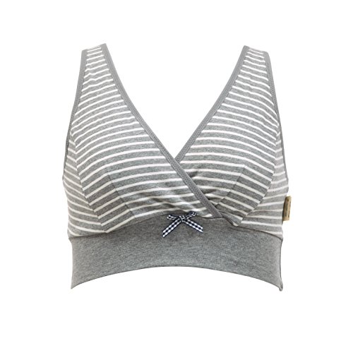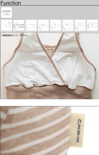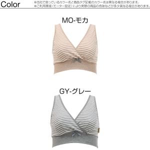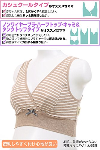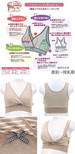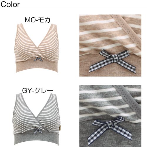 ママと犬印の共同開発商品です。授乳しやすく、着け心地のよいハーフトップです。ボーダーにブラ中心のギンガムチェックのリボンがオシャレ!金具やボタンがついてないので、就寝時など横になった時も、バスト・背中・脇・肩など肌に負担がかかりにくいです。バスト部分は、両脇パネルで立体設計です。大きくなるバストも横に流れにくく、しっかり包み込みます。深めの重なりのカシュクールタイプ。胸元が広がりにくく、母乳パッドを使用してもはみだしません。カップをサッと下げで簡単に授乳できます。バスト裏側の縫い代はデリケートな乳首を刺激しにくいです。左サイドのネームは外付けなので内側は肌あたりやさしい仕様です。アンダーはゴムを使用せずベア天竺で幅広らくちん2重仕立てで、アンダー部分をしめつけず、らくちんです。お揃いのシリーズとのコーディネイトをおすすめします。身生地:綿95% ポリウレタン5%テープ部:ナイロン85% ポリウレタン15%・着用時期の目安:産前-授乳期・カシュクールタイプ・かぶりタイプ・パッドなし、パッドポケットなし・ワイヤーなし・縦横に伸縮性あり
