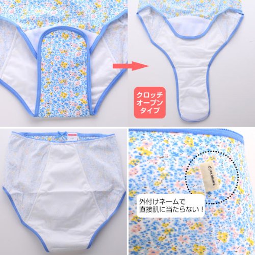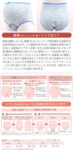 お肌にやさしい綿混素材の産じょくショーツです。クロッチが開閉するのでショーツを脱がなくてもパッドの交換ができます。ウエストまで防水布を張り、マチの幅も広いので、もしもの時も安心★ネーム外付けで、お肌への刺激をやわらげました。縦横に伸縮するので程よいフィット感です。キュートなフラワープリントシリーズでのコーディネイトをおすすめします。身生地:綿95% ポリウレタン5%コメットテープ部:ナイロン75% ポリウレタン25%テープ部:ナイロン77% ポリウレタン23%・2wayに伸縮性あり・クロッチ:付き・透感:なし・股上:約18.5cm(※M-Lサイズ置き寸法) 約19cm(※L-LLサイズ置き寸法)