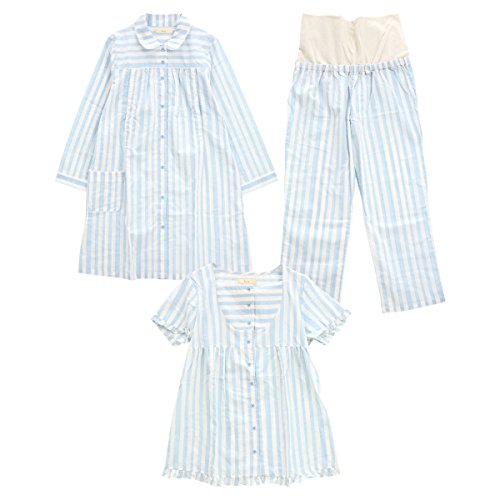診察時や分娩時、トップスだけになっても安心のワンピース丈トップス、横になった状態での着替えや、診察時に便利なフロント全開の前開きトップス、お腹を優しく包み込みフィットする腹巻き付ボトムの3点セット。