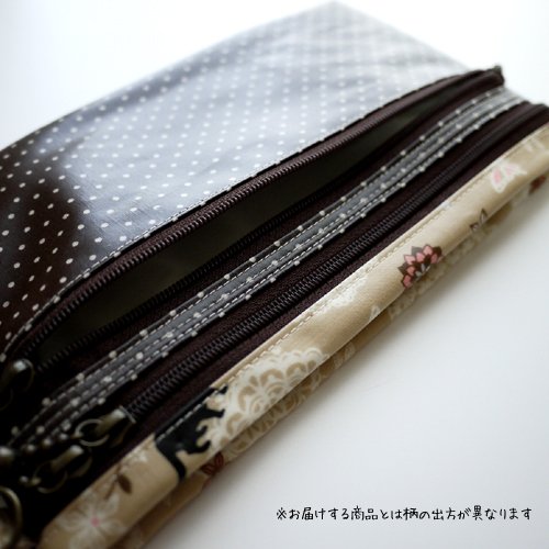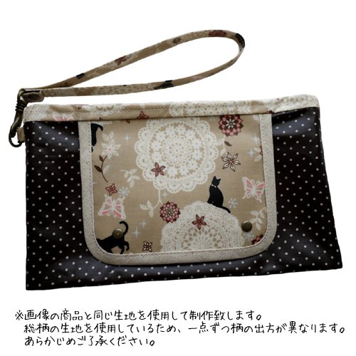 - ラミネートの生地を使用して制作しています。汚れたり濡れたりした場合にはさっと拭くだけで綺麗になります。ファスナー部分、内側は防水ではありません。