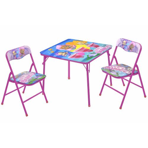 The Bubble Guppies 2-Piece Activity Desk and Chair Set is ideal for your child to do his or her homework, read a book or arts and crafts. This table is sure to become a favorite with your little one. This two-piece Bubble Guppies activity desk and chair set features one folding chair and a desk that is a wooden padded vinyl square table top on a steel frame. Both pieces of this set can be easily wiped down with a regular damp cloth. It is excellent for children between the ages of 3 to 7. This kids' folding table and chair set requires no assembly. It folds easily for storage and can be placed in any room throughout the home.