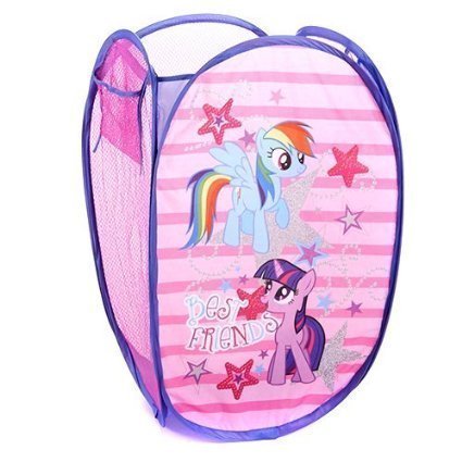 The Hasbro My Little Pony Pop Up Hamper makes a perfect addition to your child's bedroom, closet, or playroom. The pop up hamper is an easy way to maintain organization while adding a playful accent. Your little one will love to put away all their toys, books, clothing, and more in this spacious storage hamper featuring his or her favorite character. It's made of 100 percent polyester with mesh siding and reinforced carry handles. Collapsible and lightweight, our pop up hampers are perfect for storing just about anything. When not in use, it can fold down flat and be tucked away. Easy to clean using a damp cloth. Dimensions: 21.5"H x 13.5"W x 13.5"D.