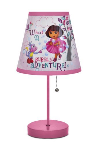 Lighten up your child's room with the adorable Nickelodeon Children's Table Lamp. The pull string switch makes turning this Dora Lamp on and off easy for your child. The lamp has a metal base with a pink finish, designed to match the theme on the shade. This Dora Lamp requires no assembly and is ready for use out of the box. Featuring Dora and Boots in a fun adventure, the shade of this Explorer Lamp brings both light and entertainment into your child's room. It is a fun addition to a little girl's room. This Nickelodeon Children's Table Lamp uses one 40 watt bulb (not included).Nickelodeon Dora the Explorer Table Lamp:Dora design featuring BootsMetal base in pinkPull-string switchRequires one 40W bulb (not included)Overall dimensions: 8"L x 8"W x 16"H