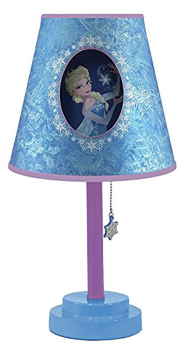 Add a touch of masterpiece to your decor with the Frozen Table Lamp with Die Cut Lamp Shade. Featuring unique and creative designs of your favorite princess and Snow Queen, the table lamp is the perfect way to light-up your child's bedroom, playroom, or study area. It is an excellent decorative accent and is small enough to fit onto any desk or side table. It features a durable metal base with canvas die cut lamp shade. No assembly required. 40-Watt bulb required, not included. Dimensions: 18" H x 9" W x 9" L; Metal base has a 5.5" circumference.