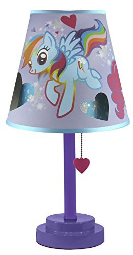 Add a touch of masterpiece to your decor with the My Little Pony Table Lamp with Die Cut Lamp Shade. Featuring unique and creative designs of your favorite ponies, the table lamp is the perfect way to light-up your child's bedroom, playroom, or study area. It is an excellent decorative accent and is small enough to fit onto any desk or side table. It features a durable metal base with canvas die cut lamp shade. No assembly required. 40-Watt bulb required, not included. Dimensions: 18" H x 9" W x 9" L; Metal base has a 5.5" circumference.