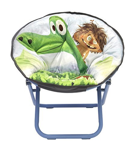 Your child can enjoy their favorite book or television show while sitting comfortably on their Disney Good Dinosaur Saucer Chair. Its saucer shape makes it perfect for lounging and relaxing. The saucer chair is made out of a sturdy metal frame with a polyester cushioned seat for extra comfort. The saucer chair can fold together making it easy to store when not in use. It is ideal for storage and travel. It's the perfect size for toddlers and small children. Maximum weight is 81 pounds. Spot clean only. Dimensions: 18" W x 18" H x 18" L.
