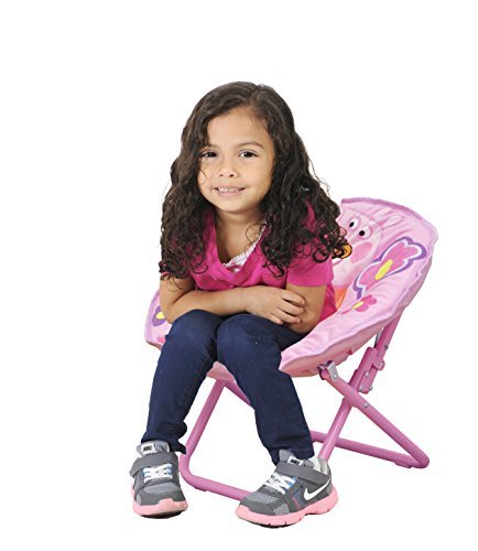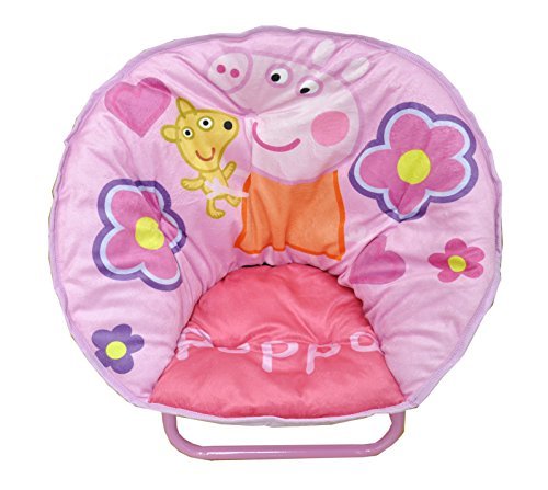 Featuring a colorful Peppa Pig design, your child can enjoy their favorite book or television show while sitting comfortably on his or her Peppa Pig Toddler Saucer Chair. Its saucer shape makes it perfect for lounging and relaxing. The chair is composed out of a sturdy metal frame with a polyester cushioned seat for extra comfort. When not in use, it can fold together for easy storage and travel. It's the perfect size for toddlers and small children. Maximum weight is 81 pounds. Spot clean only. No assembly required. Dimensions: 18" W x 18" H x 18" L.