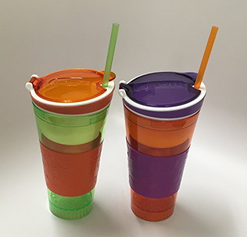 Clever design lets you hold a 16 oz. drink and your favorite snack, all in one hand;Seal perfectly to keep snacks fresh in the cup;Dishwasher safe;Great for snacking in the car, on the couch at home, and perfect for parties!;Pack of 2 Cups Comes With 1 Green & 1 Orange