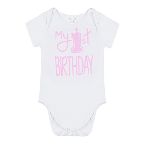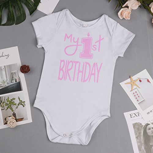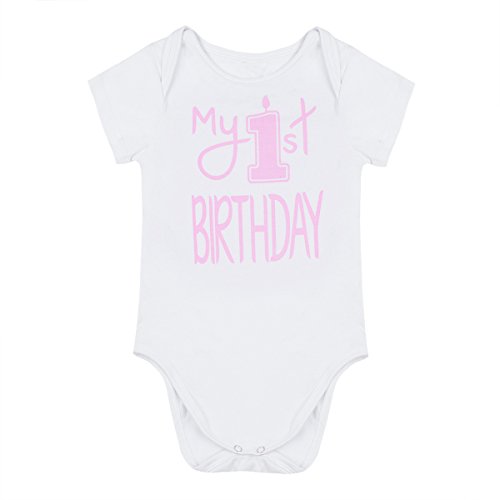 - ショートスリーブ、ショルダーシャーリング、フロントには「My 1st Birthday」という文字が印刷されています。