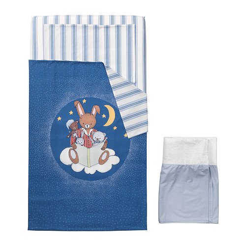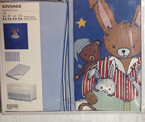 (4) Piece Baby's Crib Linen Gift Set ~ (1) Medium Blue Duvet with the Moon, Stars, Bear & Bunnies, (1 Ea) Blue Striped Sheet & Matching Pillowcase & (1) Pale Blue Crib Skirt by IKEA