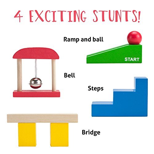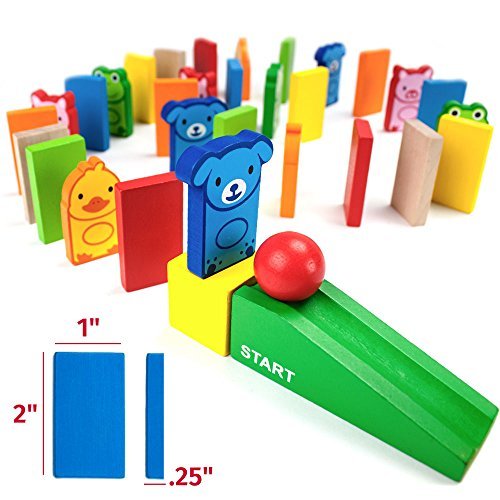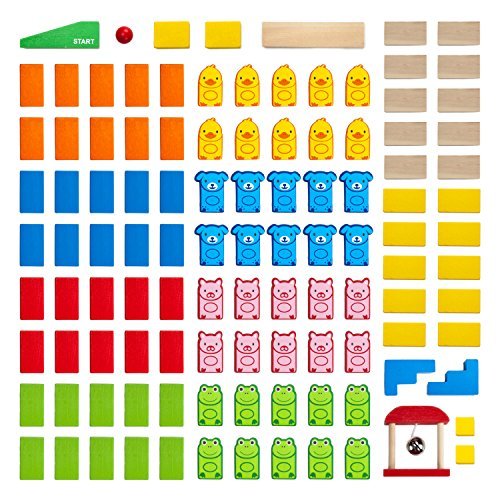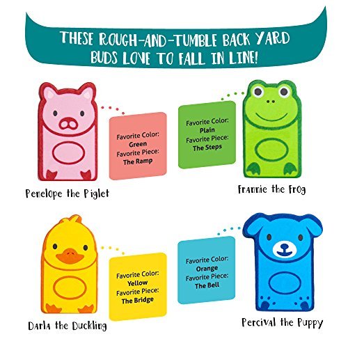 What's in the Box? 110 pieces, including four friendly backyard pals, six fun colors, and four exciting stunts: steps, a bridge, a swinging bell, and ramp. Each domino measures approximately 2" tall, 1" wide, and .25" thick.