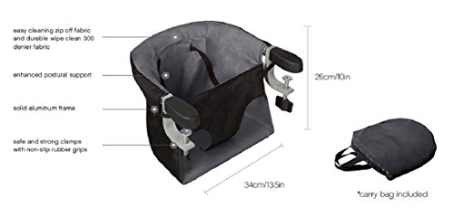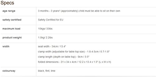 Clamps on to most tables and bench tops; 0.8 up to 2 thick and suitable for indoor and outdoor use;Weighs just 2.2 pounds and has a compact fold to fit easily into diaper bags, purses, and buggy;Comes in three colors (black, flint and lime) and includes a recyclable carrybag;Aluminum frame with padded back support, a shoulder harness system and robust aluminum clamps with;Not suitable for use on glass top tables, tables with loose table tops, table leaves, single