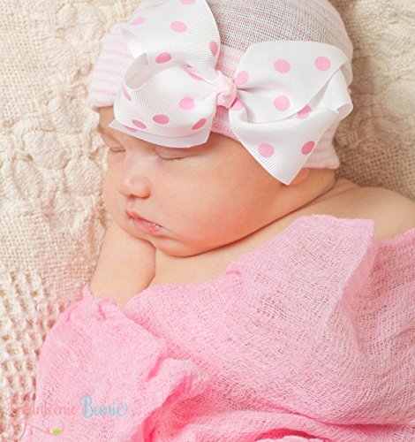Infanteenie BeenieピンクandホワイトStriped Hat with Polka Dot Bow