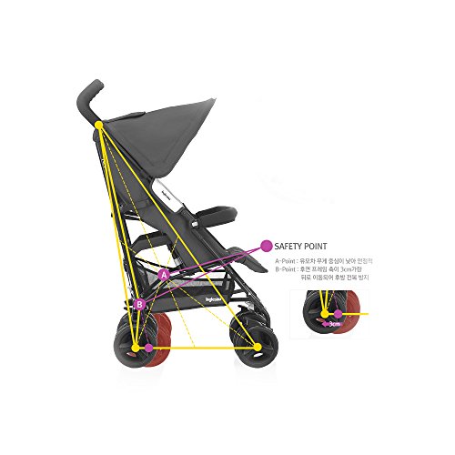 - ハンドルに多くの荷物がかかってもベビーカーができるだけ後ろに倒れないように安全に設計された