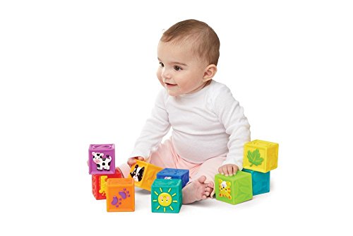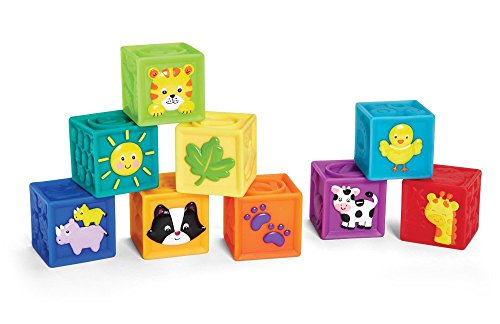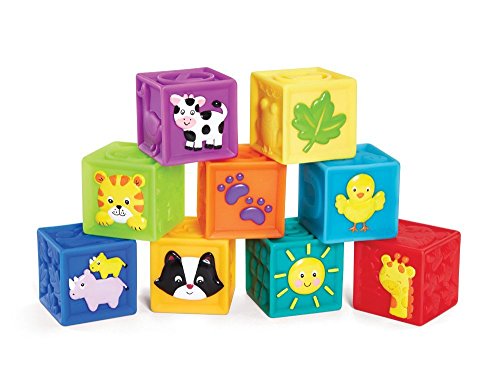 These 9 soft, squeaker blocks with embossed pictures are so much fun! One side of each cube is colorfully decorated. Baby can stack up and knock down! Enhances hand/eye coordination.