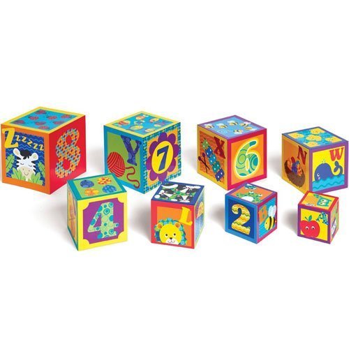 These 8 sturdy colorful cubes are fun for baby to stack. Build a tower while learning letter and number recognition. Cubes nest for easy storage.