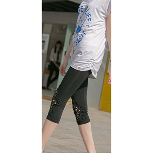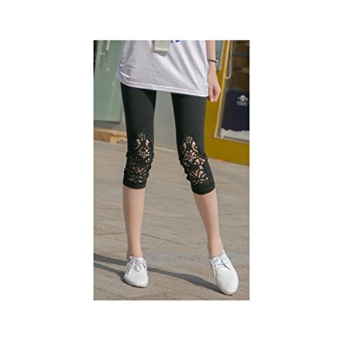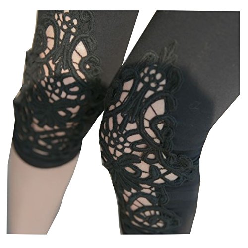 beauty factory 刺繍レギンス 七分丈 コットンレース 美脚スパッツ 選べる 6色 白 紫 灰色 黒 青 ピンク (黒)
