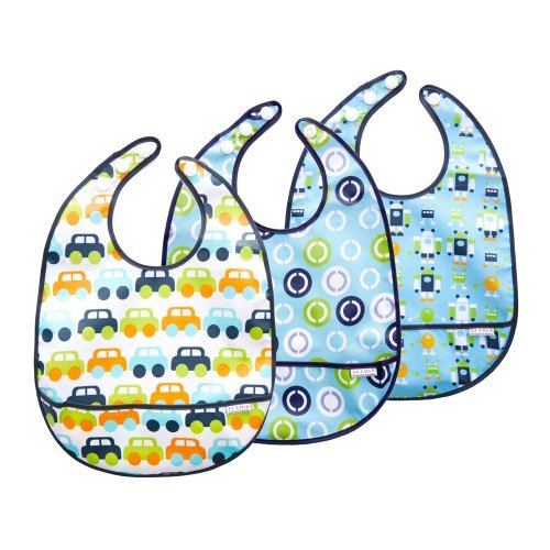 Three pack bib set;Wipeable fabrics for easy clean up;Convenient three-snap closure, adjustable fit;Catch-all pocket;PVC and phthalate free