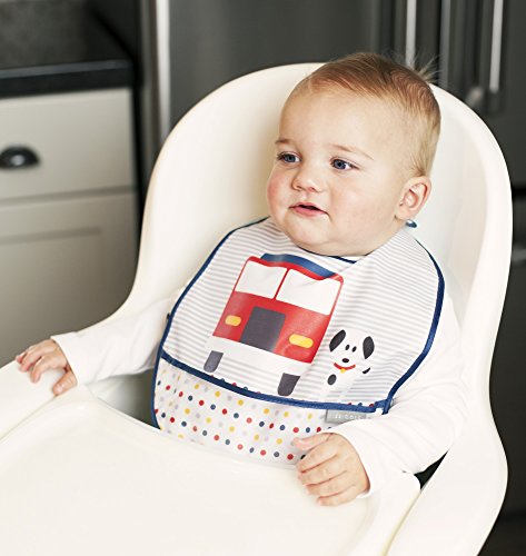 Three coordinating bibs;Easy-to-clean laminated material;Convenient three-snap closure for adjustable fit;Catch-all pocket;PVC and phthalate free