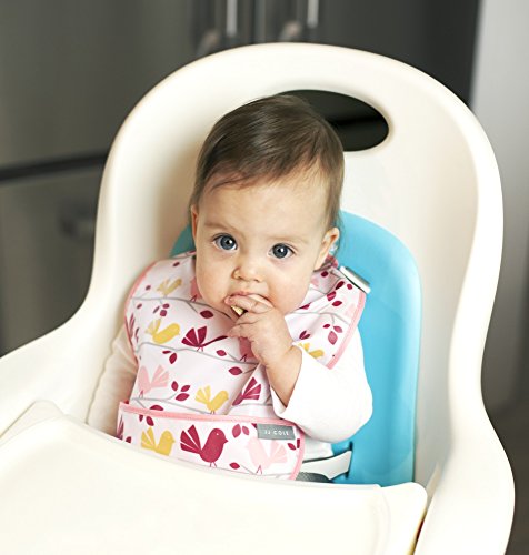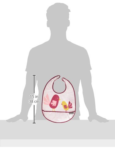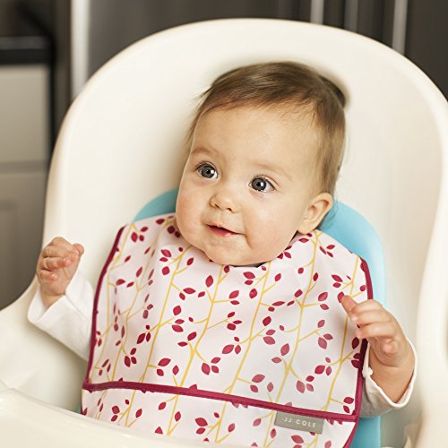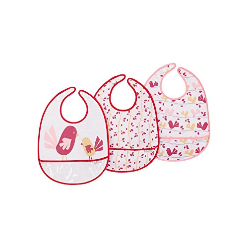 Three coordinating bibs;Easy-to-clean laminated material;Convenient three-snap closure for adjustable fit;Catch-all pocket;PVC and phthalate free