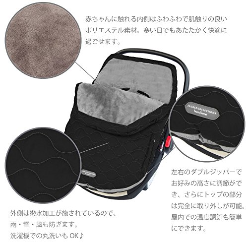 - 外側は撥水加工で雨や風を防ぎ、内側はフワフワの肌触りの良い素材であたたかいフットマフ。ベビーカー、カーシートに取り付け可能です。