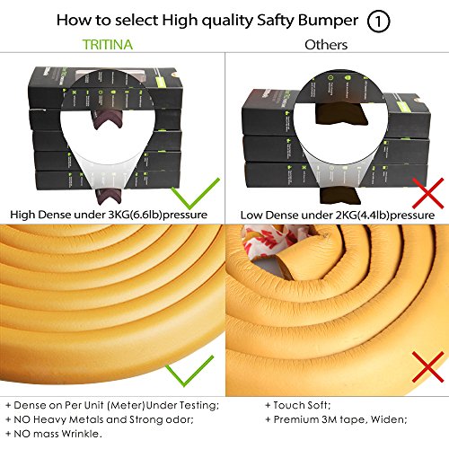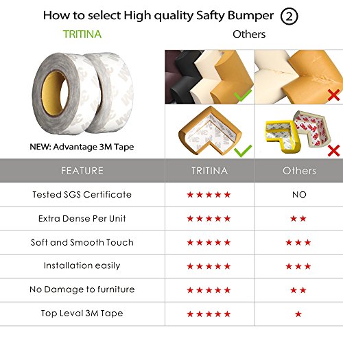 Keep your baby away from dangerous, sharp edges and corners or other solid stuffs. Tritina high-density, and soft touch, and are able to absorb impact to help prevent injury. And remove without leaving marks.;Health. NO toxic flame-retardants (SCCPs). No BPA, no phthalates, no heavy metals. With flame-resistant foam.;Densest and soft: Density and softening impact.;GENUINE double-sided tape: that is wider and longer meet the Cushion and Edge.;Products have passed the international Child proof certification