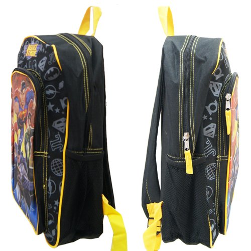 【アメリカ買付商品】 JUSTICE LEAGUE(ジャスティスリーグ)リュックサック(大)ブラック たっぷり入る大きめ軽量リュックサック☆ 小旅行にも大活躍☆ 前面ファスナー付きポケット付 両サイドにはメッシュポケット各1付き サイズ:横30cm×高さ39cm×まち12cm 背中部分30cm×39cm 素材:ポリエステル他 輸入国:アメリカ 生産国:中国