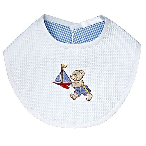 Embroidered with adventurous Teddy and his boat;Made by Zulu women in South Africa;Absorbent waffle weave front, coordinating gblue gingahm lining;Velcro closure for quick and easy dressing