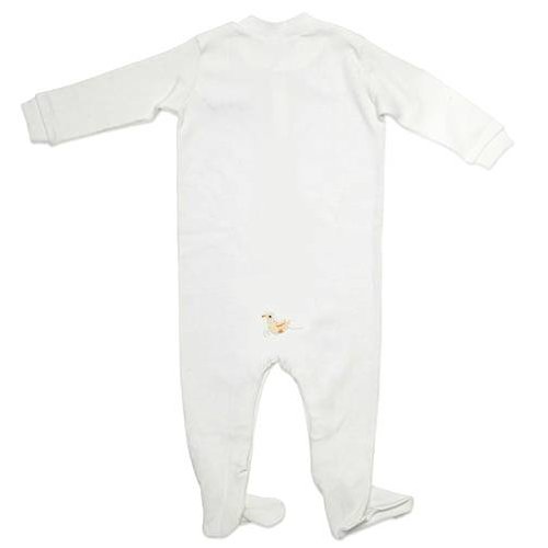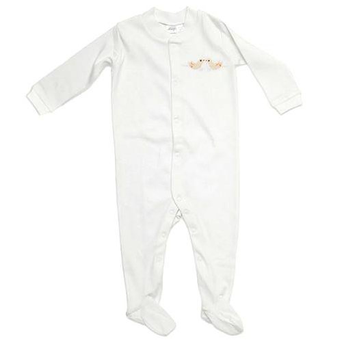 Exquisite hand embroidered pink rosebuds and a butterfly embroidered on baby's chest and a delicate single rosebud on the back;Snaps from neckline to both feet for easy changes;Adorable hand embroidered yellow ducks on the front and a single duck on the back make this footie perfect for a baby boy or girl;Machine wash cold;Beautifully packaged and labeled in a pillow pack making it a perfect baby gift
