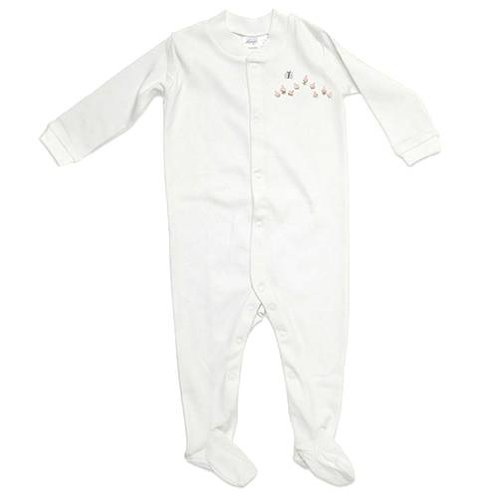 Luxuriously soft pure combed cotton;Snaps from neckline to both feet for easy changes;Exquisite hand embroidered pink rosebuds and a butterfly embroidered on baby's chest and a delicate single rosebud on the back;Machine wash cold;Beautifully packaged and labeled in a pillow pack making it a perfect baby gift